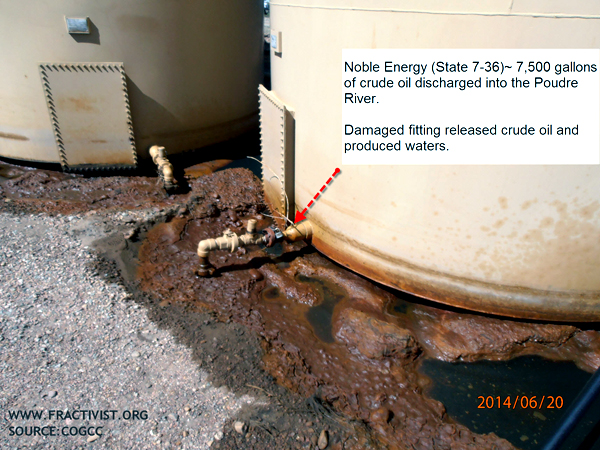 Though more than 100 feet away from the river’s normal course, excessive runoff wiped out a protective berm at the Noble Energy well site State 7-36, damaged crude oil tanks and broke key valves on what industry terms a “produced water tank” causing the chemicals to drain into the river. While the crude oil and other liquid wastes were releasing, the oil tanks began to float—quickly becoming lifted by the buoyant liquids accumulating under the tanks and unhinging them from their moorings. The tanks then spilled even more crude oil and other toxins into the river. The state mandated anchors fastened to the tanks to prevent them from moving or spilling completely failed. Worse, because of inadequate oversight, it is unknown how long State 7-36 was draining into the Poudre before inspectors became aware of the situation.