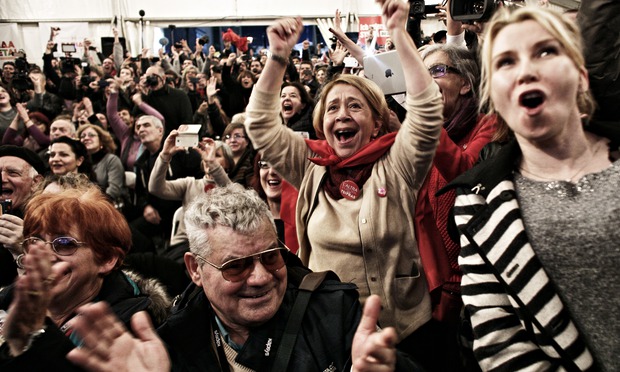 Supporters of the opposition Syriza party cheer the results in Athens, Greece. Photograph: Milos Bicanski/Getty Images Europe