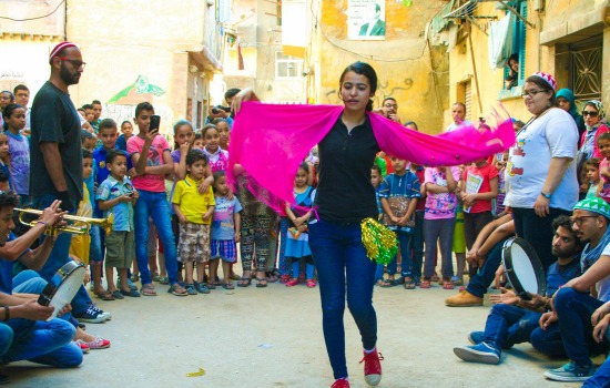 Street Carnival performing in Cairo Location: Association for the Protection of the Environment, Zabaleen neighborhood, Mansheyat Nasser. (Photo: Kirllos Yousif)