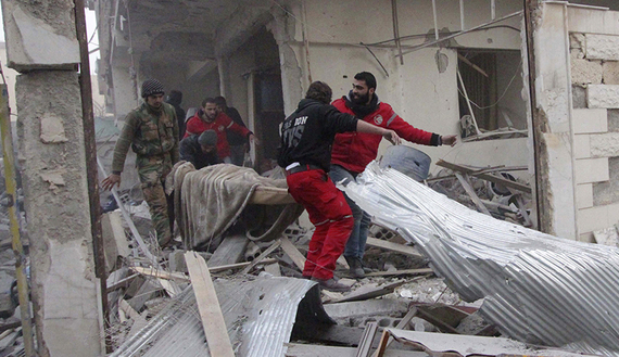Red Crescent members and residents remove a body from a damaged site after what activists said were airstrikes by forces loyal to Syria’s President Bashar al-Assad in Douma, eastern Ghouta, near Damascus, Jan. 25, 2015. (photo by REUTERS/Badra Mamet)