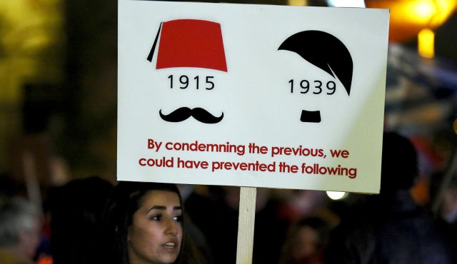A vigil after a church service commemorating the centenary of the massacre of 1.5 million Armenians by Ottoman forces, in Berlin, April 23, 2015.