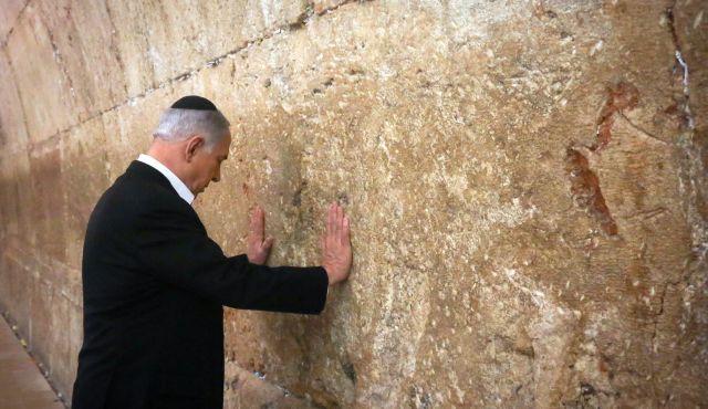 Israel’s Prime Minister Benjamin Netanyahu touches the Western Wall during a visit in Jerusalem’s Old City, Feb. 28, 2015.