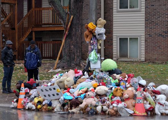 Two men look at a makeshift memorial on November 23 in Ferguson, Missouri, where Darren Wilson shot and killed Michael Brown