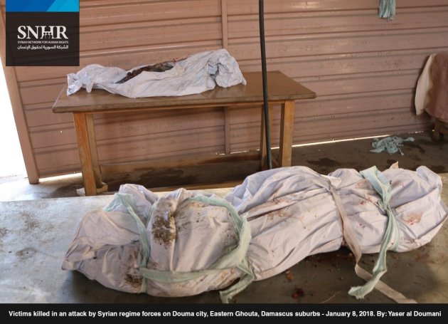 Victims killed in an attack by Syrian regime forces on Douma city, Eastern Ghouta, Damascus suburbs – January 8, 2018. By: Yaser al Doumani