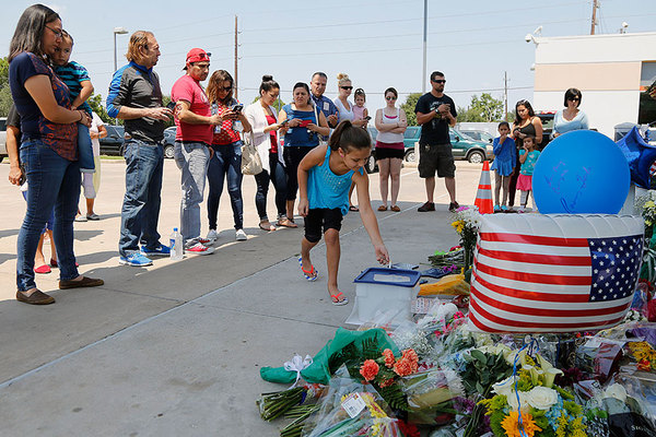 Kayleigh Martinez places coins in a donation box at a makeshift memorial for Harris County Sheriff’s Deputy Darren Goforth Saturday at a gas station in Houston.