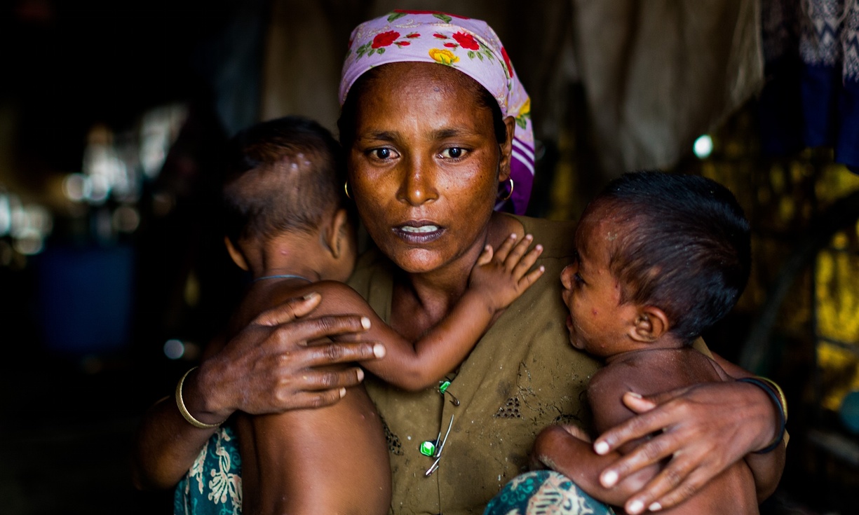 Shamijder, a Rohingya refugee, with her one-year-old twins. An estimated 110,000 Rohingya live in an overcrowded camp on the outskirts of Sittwe, Myanmar. Photograph: Anadolu Agency/Getty Images