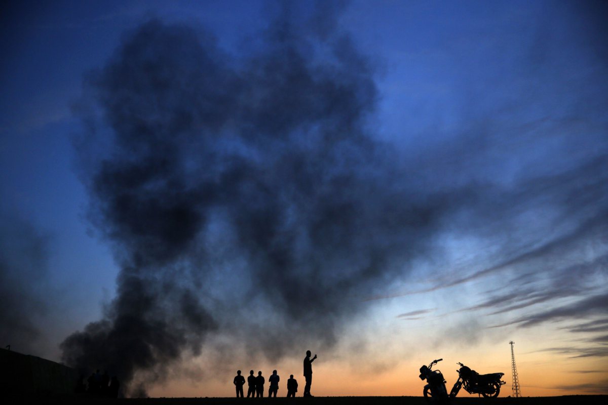 Kurdish refugees stand and walk on a hilltop as thick smoke rises from the Syrian town of Kobani during heavy fighting between Islamic State and Kurdish Peshmerga forces in Sanliurfa province, Turkey on Oct. 26, 2014.